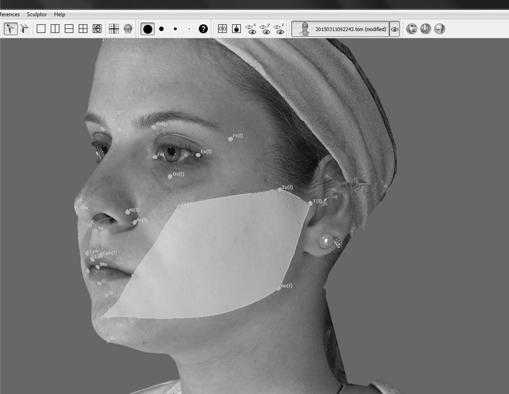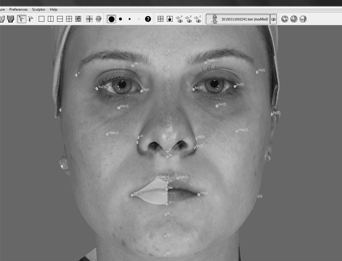Objective: To analyze variations in soft facial tissue by using the interocclusal stabilization splint (ISS) through the 3D stereophotogrammetry technique in a group of young women with temporomandibular disorder (TMD). Material and Methods: 20 females between 20 and 60 years of age (39.3 ± 12.5) and TMD diagnosis based on the criteria of the RDC/TMD, received treatment with ISS. Reference points were marked on the face and photos were performed twice using the Vectra (M3–Canfield®): with and without ISS. In the 3D images the following variables were measured: area of the cheeks and lips (cm3), linear labial distances (Ls-Cph, Cph-Ch, Li-Ch, Ls-Li, Ch-Ch), lower third of the face (Sn-Me), height of the upper lip (Sn-Ls)/lower (Li-Me) and the angles C-Sn-Ls, N-Sn-Pg and Li-Sl-Pg. The data were analyzed in a descriptive manner, the times with and without ISS were compared using the t-test and the Pearson's correlation was employed in order to correlate the ISS thickness with the facial measurements (5% significance). Results: A statistically significant difference was found only for the variables of the lip area (p= 0.01) and Ls-Li (p=0.006) in comparison with/without ISS. No correlation was found between the ISS thickness and the lip area for both face sides, right (p=0.7; r=0.07) and left (p=0.9; r=-0.001). Conclusions: The use of interocclusal stabilization splint does not provide large changes in facial morphology, with the exception of the lip area and height.Downloads