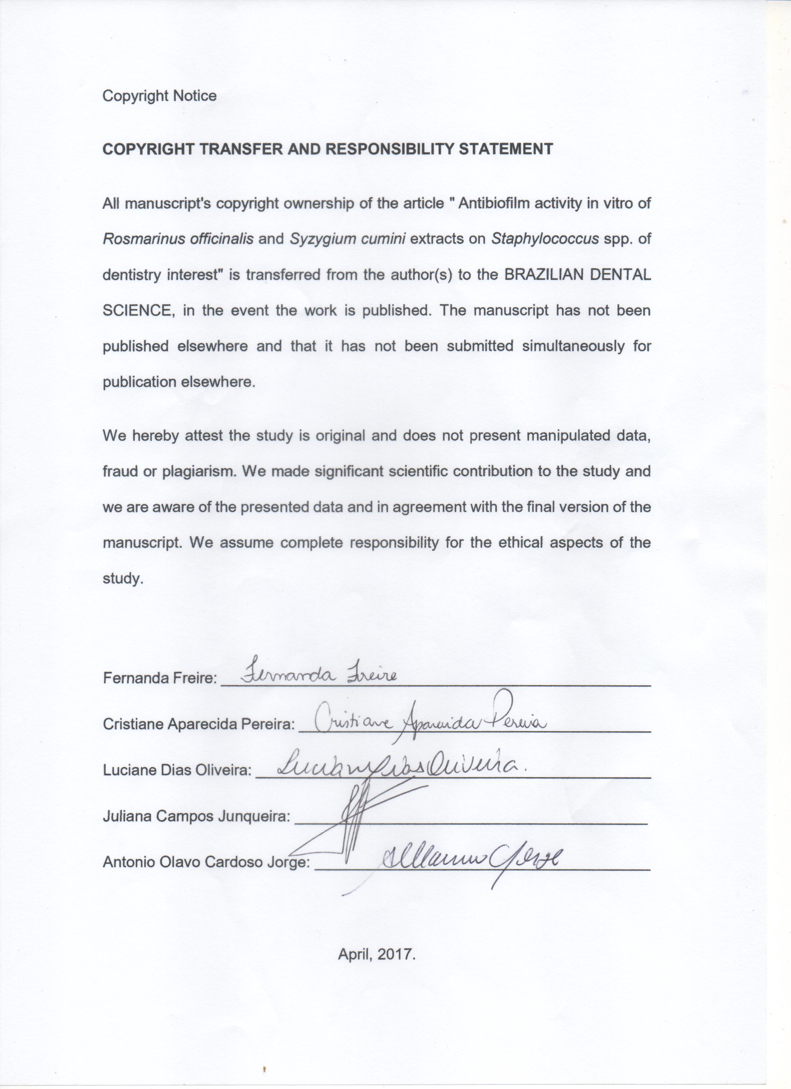 Brazilian Dental Science uses the Creative Commons (CC-BY 4.0) license, thus preserving the integrity of articles in an open access environment. The journal allows the author to retain publishing rights without restrictions.